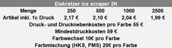 Produktion im "Lebenshilfe"-BetriebDesign-Eiskratzer aus zwei Komponentenmit breiter Kratzkante und Eisbrecher-Zacken besonders stabil und ein HandschmeichlerMaße: 207 x 95 x 27 mmFarben: - schwarz + grau (01), gelb (02), orange (03), rot (04), blau (05), neongelb (26), neongrün (27), neonpink (28), neonblau (29) - anthrazit + grau (06), hellgrau (07), grün (08), lime (09), blau (10), pink (11), magenta (12), lila (13), hellblau (14) weiß + gelb (20), rot (21), blau (22), schwarz (23)Druckfläche: 70 x 10 mmGewicht: 62gMindestbestellmenge: 250 Stück