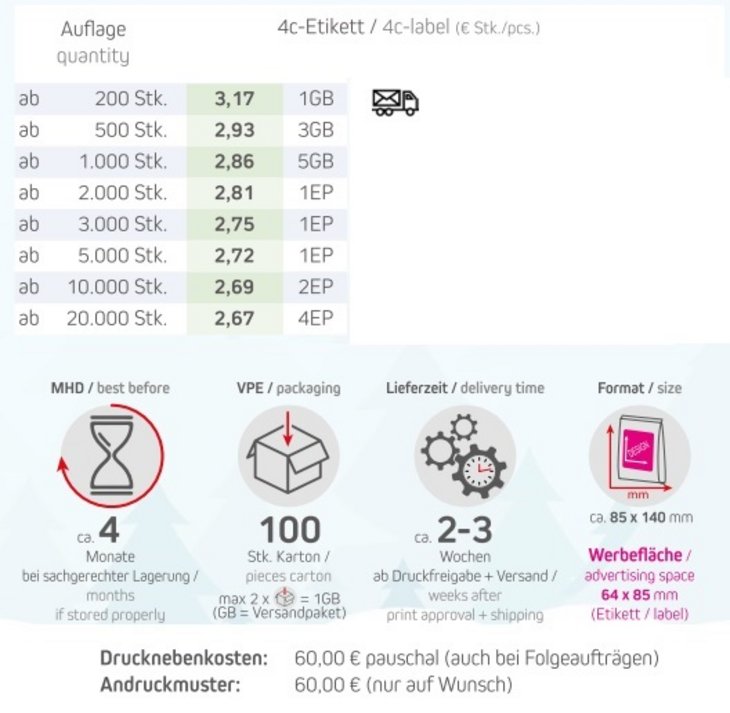 Edle Feuergebrannte Bio Mandeln 30g in einem Mini Standbeutel, perfekt für jede Messe, Infostand oder für das Büro.Body Label individuell bedruckbar mit einem Firmenlogo oder Werbebotschaft.Artikel: Feuergebrannte Mandeln 30gHaltbarkeit: ca. 4 Monate bei sachgerechter LagerungDruck: 4c Digitaldruck WerbekarteWerbefläche: 74 x 95 mmVerpackungstyp: Standbeutel Midi aus Kraftpapier ca. 85 x 140mmLieferzeit: ca. 2-3 Wochen nach Druckfreigabe + Versand. Optional ist der Standbeutel auch in Schwarz erhältlich, Anfrage mit Art.-Nr. 01902 angebenMindestmenge: 200 StückZutaten Bio Feuergebrannte Mandeln: MANDELN*, Rohrohrzucker*, Zimt*, Kakao*, *aus kontrolliert biologischem Anbau.Nährwerte pro 100g: Energie: 2037 kJ / 488 kcal, Fett: 27 g, davon gesättigte Fettsäuren: 1,9 g, Kohlenhydrate: 52,3 g, davon Zucker: 49,8 g, Eiweiß: 9,4 g, Salz: <0,01 g