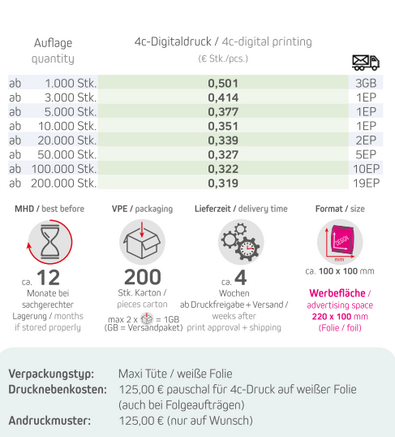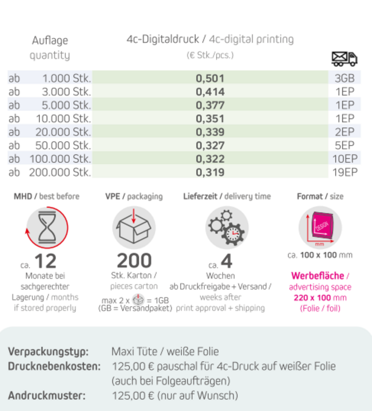 Produkt: Maxi Tüte / weiße FolieInhalt: Bio Mini-Brezeln Original 7gFormat: ca. 100 x 100 mmDruck: 4c-DigitaldruckWerbefläche: 220 x 100 mmLieferzeit: ca. 4 Wochen ab Druckfreigabe + VersandVPE: 200 Stk. / KartonHaltbarkeit: ca. 12 Monate bei sachgerechter LagerungMindestbestellmenge: 1000 Stück