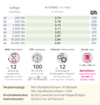 Verpackungstyp: Mini Standbeutel braun / KraftpapierInhalt: Bio Instant Kaffee 20gFormat: ca. 140 x 85 mmWerbefläche: 4c-Etikett 64 x 85 mm Lieferzeit: 12 Arbeitstage ab Druckfreigabe + VersandVPE: 100 Stk. / KartonHaltbarkeit: ca. 12 Monate bei sachgerechter LagerungMindestbestellmenge: 200 Stück