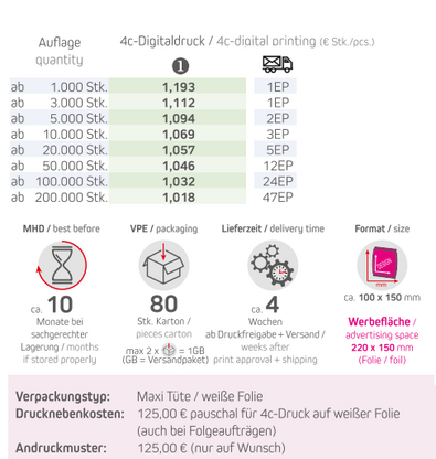 Verpackungstyp: Maxi-Tüte / weiße FolieInhalt: Bio Müsli Erdbeerchen 50gFormat: ca. 100 x 150 mmDruck: 4c-DigitaldruckWerbefläche: 220 x 150 mmLieferzeit: ca. 4 Wochen ab Druckfreigabe + VersandVPE: 80 Stk. / KartonHaltbarkeit: ca. 10 Monate bei sachgerechter LagerungMindestbestellmenge: 1000 Stück
