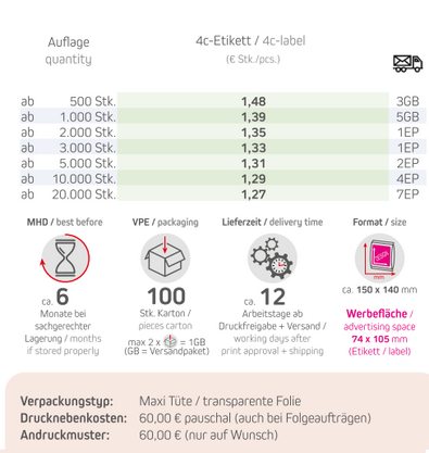 Produkt: Maxi Tüte / transparente FolieInhalt: Vegane Bio Apfelchips 15gFormat: ca. 150 x 140 mmDruck: 4c-EtikettWerbefläche: 74 x 105 mm Lieferzeit: ca. 12 Arbeitstage ab Druckfreigabe + VersandVPE: 100 Stk. / KartonHaltbarkeit: ca. 6 Monate bei sachgerechter LagerungMindestbestellmenge: 200 Stück Inhalt:Zutaten Bio Apfelchips: Apfelchips*; aus Bio-Anbau