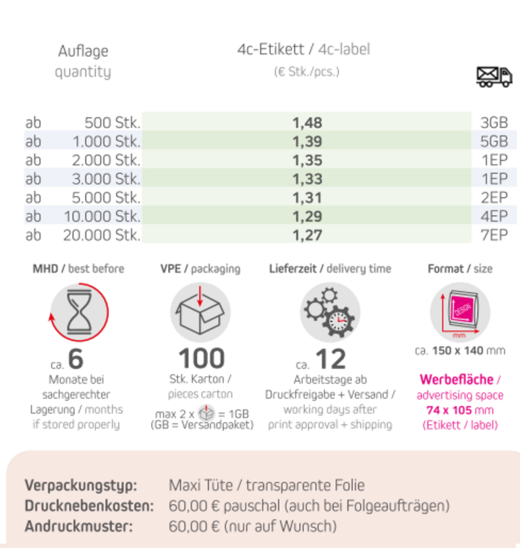 Preisliste Bio Apfelchips 15g Express Maxi-XL-Tüte mit Logo Details