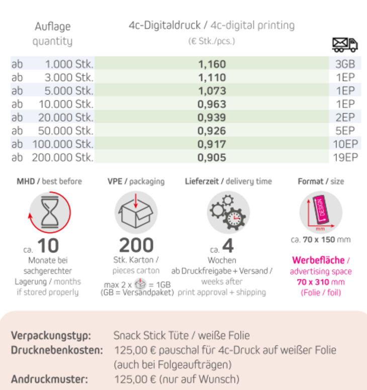 Produkt: Stick Tüte / weiße FolieInhalt: 15g Bio ApfelwürfelFormat: ca. 70 x 150 mmDruck: 4c-DigitaldruckWerbefläche: 70 x 310 mmLieferzeit: ca. 4 Wochen ab Druckfreigabe + VersandVPE: 200 Stk. / KartonHaltbarkeit: ca. 10 Monate bei sachgerechter LagerungMindestbestellmenge: 1000 Stück