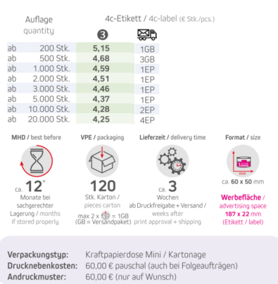 Produkt: Biologisch abbaubare Eco Pappdose MidiVerpackungstyp: Kraftpapierdose midi / Kartonage braunInhalt: Bio Pfefferminz Drops 40gFormat: ca. 60 x 50 mmDruck: DigitaldruckWerbefläche: 4c-Etikett 187 x 22 mm (gemäß Standskizze)Haltbarkeit: ca. 12 Monate bei sachgerechter LagerungVerpackung: 120 Stück / KartonLieferzeit: ca. 3 Wochen ab Druckfreigabe + VersandMindestbestellmenge: 200 Stck.
