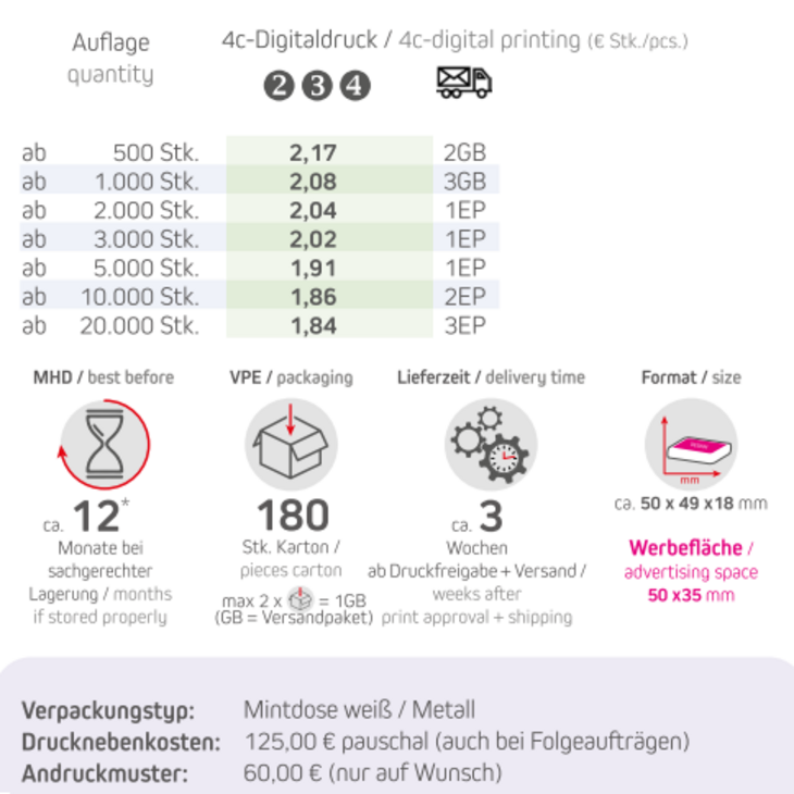 Verpackung: Mintdose weiß / MetallInhalt: Bio Traubenzucker Orange Drops 20gFormat: Mintdose: ca. 50 x 49 x 18 mmDruck: 4c-Digitialdruck Werbefläche: Mintdose: 50 x 35 mmLieferzeit: ca. 3 Wochen ab Druckfreigabe + VersandVPE: 180 Stk. / KartonHaltbarkeit: ca. 12 Monate bei sachgerechter LagerungMindestbestellmenge: 500 Stück