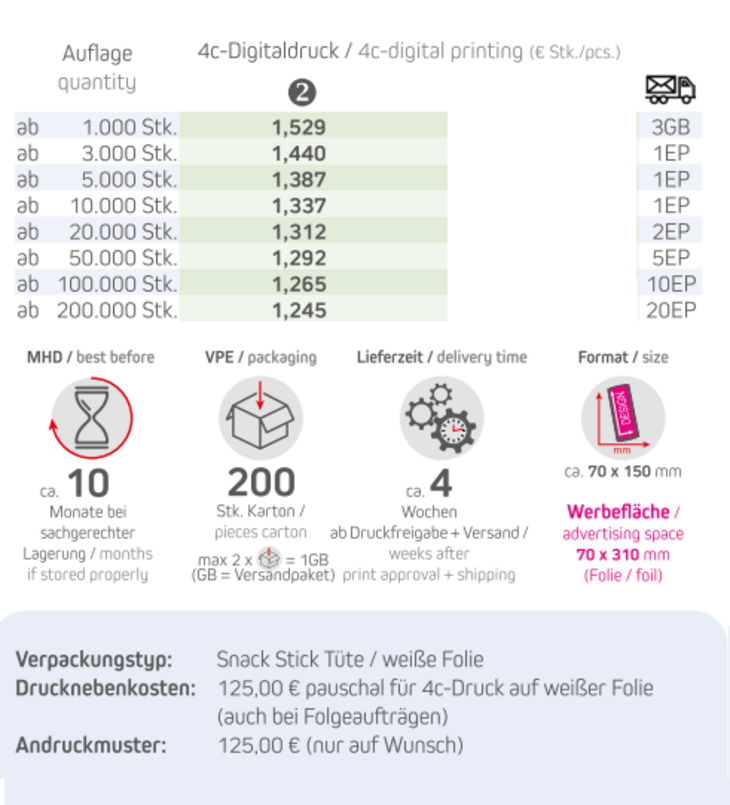 Produkt: Snack Stick Tüte / weiße FolieInhalt: 30g Bio Nusskern-MixFormat: ca. 70 x 150 mmDruck: 4c DigitaldruckWerbefläche: 70 x 310 mmLieferzeit: ca. 4 Wochen ab Druckfreigabe + VersandVPE: 200 Stk. / KartonHaltbarkeit: ca. 10 Monate bei sachgerechter LagerungMindestbestellmenge: 1000 Stück
