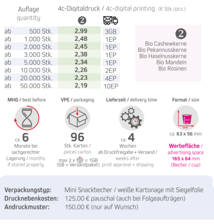 Verpackungstyp: Mini Snackbecher / weiße Kartonage mit SiegelfolieInhalt: Bio Studentenfutter 40gFormat: ca. 63 x 56 mmDruckart: DigitaldruckWerbefläche: 165 x 64 mmVerpackung: 96 Stück / KartonLieferzeit: ca. 4 Wochen ab Druckfreigabe + VersandMindestmenge: 500 Stk.Haltbarkeit: ca. 6 Monate bei sachgerechter Lagerung