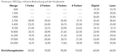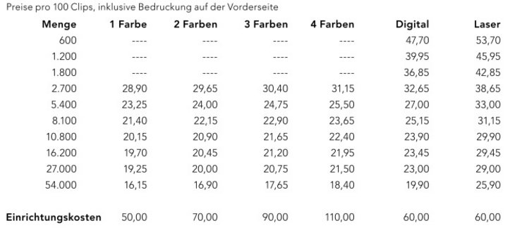 Die spezielle Büroklammer in 11 verschiedenen Formen, geeignet zum Haften von maximal 15 SeitenMaterial: Rostfrei Federbandstahl, 0,25mm Dicke, die Größe ist formabhängigDruck: Auf der Vorderseite des Clips, in Tampondruck, Digitaldruck nach Euroskala oder LasergravurVerpackung: Zu 150 Clips in KlarsichtboxenLieferzeit: 3-4 Wochen nach DruckfreigabeMindestbestellmenge: 2.700 Stück