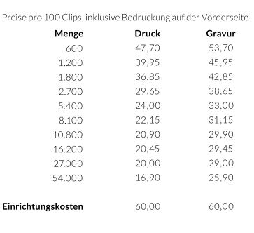 Beschreibung: die beste und stärkste Büroklammer, geeignet zum Haften von maximal 18 SeitenMaterial: Rostfrei Federbandstahl, Dicke 0,25 mm, Größe 14 x 29 mm, entgratetDruck: auf der Vorderseite des Clips in Digitaldruck Euroskala oder LasergravurVerpackung: zu 100 Clips, in standard Deskbox aus recycletem Karton mit Kraftpapier-FinishLieferzeit: ca. 2-3 Wochen nach DruckfreigabeMindestbestellmenge: 600 Stück