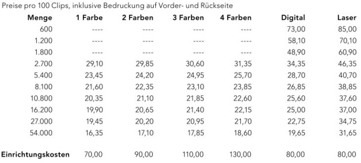 Preisliste Wingclip shape Büroklammer Druck beidseitig mit Logo