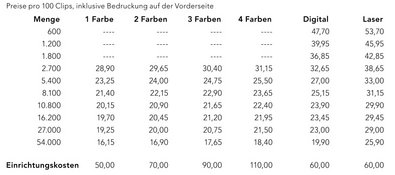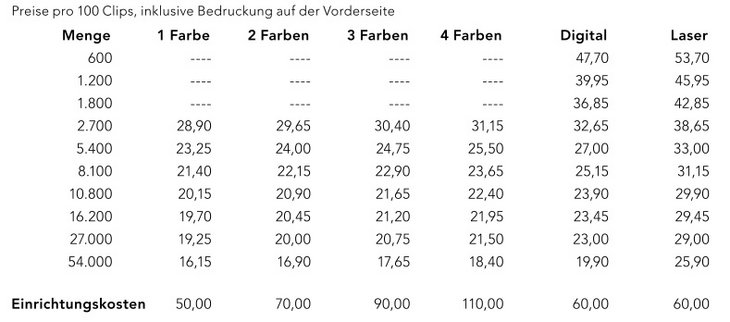 Preisliste Wingclip Shape mit Druck oder Laser Details