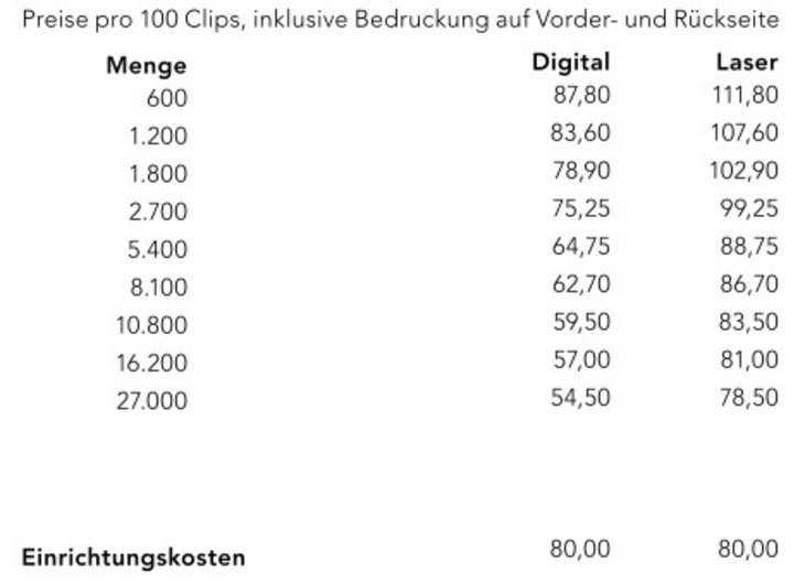 Preisliste für beisetigen Druck Wingclip XL Büroklammer Details