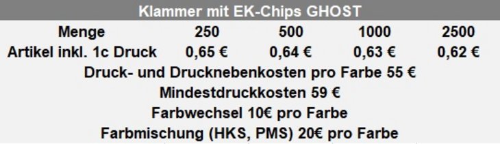 Preisliste Klammer mit EK-Chips GHOST mit Logo
