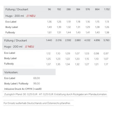 Preisliste (€) HUGO Dose 200ml mit Logo