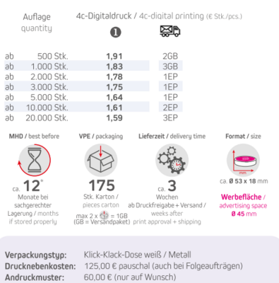 Preisliste Pfefferminz Drops 20g Klick-Klack-Dose mit Logo Details