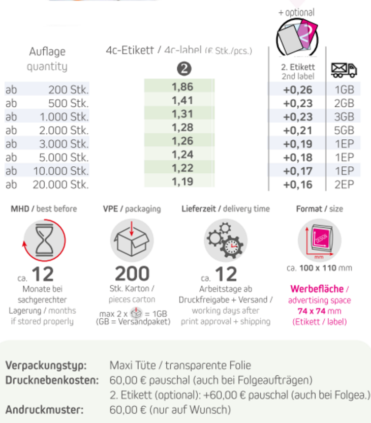Produkt: Maxi Tüte / transparente FolieInhalt: Bio Gummibärchen mit Gelatine 30gFormat: ca. 100 x 110 mmDruckart: DigitaldruckOptional: 2. Etikett möglich!Werbefläche: 4c-Etikett 74 x 74 mm Lieferzeit: ca. 12 Arbeitstage ab Druckfreigabe + VersandVPE: 200 Stk. / KartonHaltbarkeit: ca. 12 Monate bei sachgerechter LagerungMindestbestellmenge: 200 Stück
