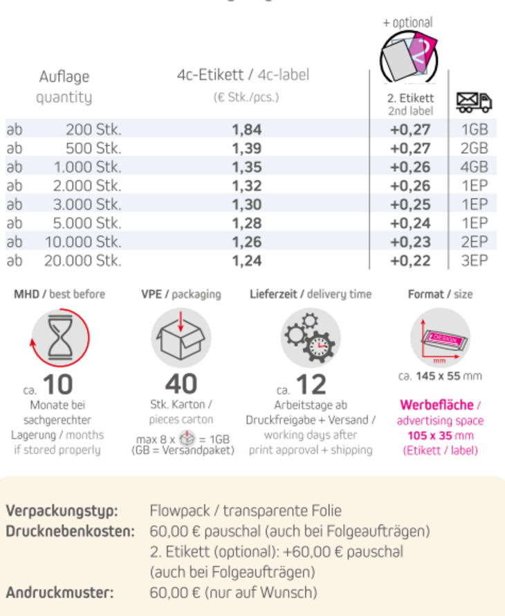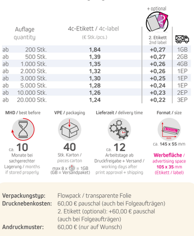 Produkt: Flowpack / transparente FolieInhalt: Müsliriegel Vanille-Cranberry 40gFormat: ca. 145 x 55 mmDruck: 4c-Etikett Werbefläche: 105 x 38 mm Optinal: 2. Etikett möglich - Bitte Standskizze anfordern!Lieferzeit: ca.12 Arbeitstage ab Druckfreigabe + VersandVPE: 40 Stk. / KartonHaltbarkeit:ca. 10 Monate bei sachgerechter LagerungMindestbestellmenge: 200 Stück