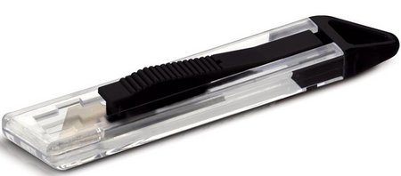Transparentes Sicherheits-Cuttermesser mit farbigen Teilen und automatischem Klingenrückzug.