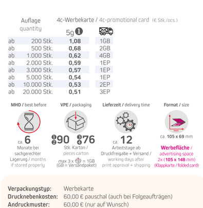 Inhalt: Schoko-HerzVerpackungstyp: WerbekarteFormat: ca. 105 x 69 mmWerbefläche: 4c-Werbekarte 105 x 148 mm Lieferzeit: ca. 12 Tag ab Druckfreigabe + VersandVPE: 90 Stk. / KartonHaltbarkeit: ca. 6 Monate bei sachgerechter LagerungMindestbestellmenge: 200 Stück