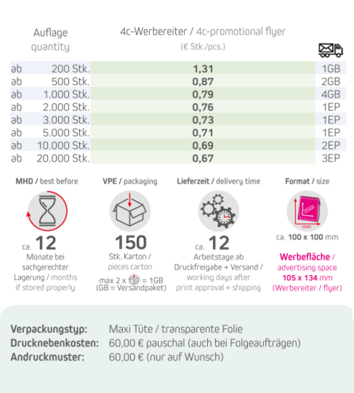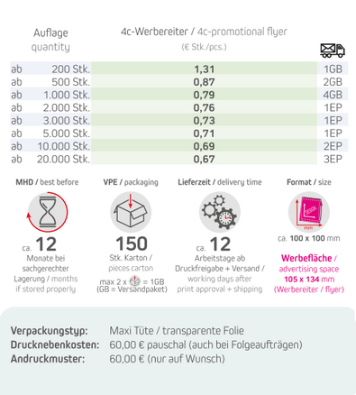 Verpackungstyp: Maxi Tüte / transparente FolieProdukt: Bio Mini Brezeln Format: ca. 100 x 100 mmWerbefläche: 4c-Werbereiter 105 x 134 mm Lieferzeit: ca. 12 Arbeitstage ab Druckfreigabe + VersandVPE: 150 Stk. / KartonHaltbarkeit: ca. 12 Monate bei sachgerechter LagerungMindestbestellmenge: 200 Stck.