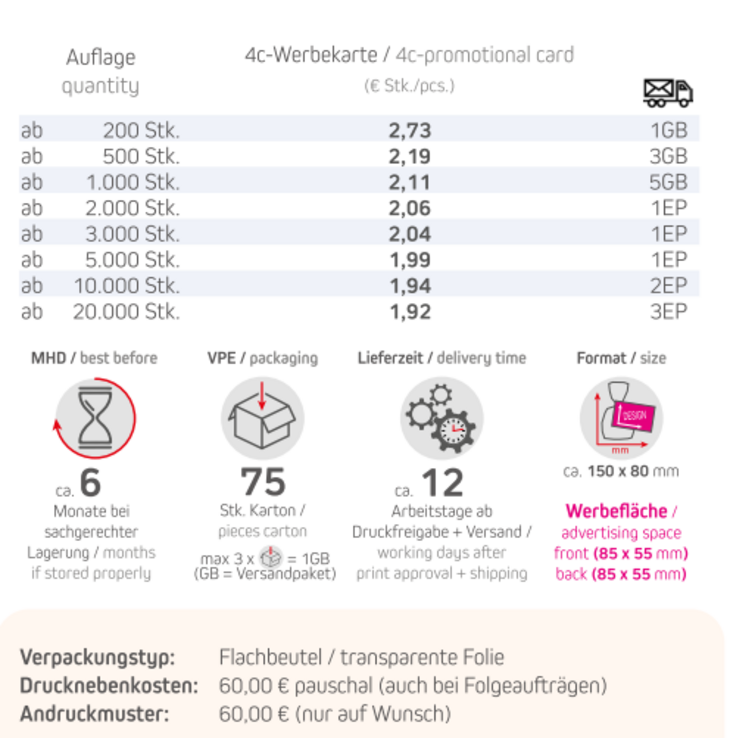 Produkt: Flachbeutel / transparente FolieInhalt: 30g Bunte Schoko-Erdnüsse Format: ca. 150 x 80 mmWerbefläche: 4c-Werbekarte 85 x 55 mm (Vorderseite und Rückseite möglich)Lieferzeit: ca. 12 Arbeitstage ab Druckfreigabe + VersandVPE: 75 Stk. / KartonHaltbarkeit: ca. 6 Monate bei sachgerechter LagerungMindestbestellmenge: 200 Stück
