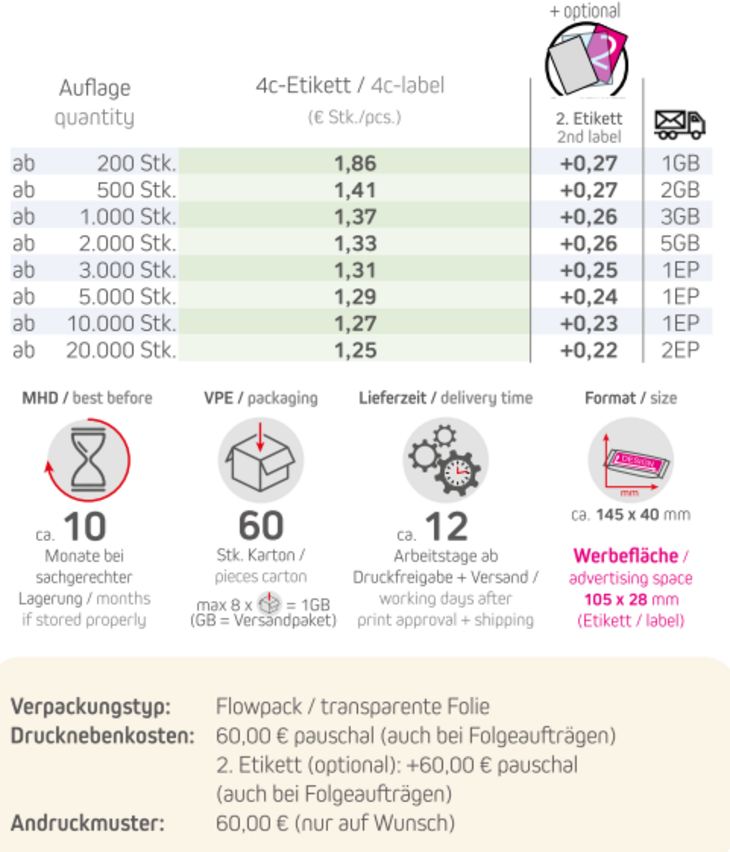 Produkt: Flowpack / transparente FolieInhalt: Veganer Bio Müsliriegel Multikorn-Himbeere 30gFormat: ca. 145 x 40 mmWerbefläche: 4c-Etikett 105 x H 28 mm Optional: 2. Etikett möglich!Lieferzeit: ca. 12 Arbeitstage ab Druckfreigabe + VersandVPE: 60 Stk. / KartonHaltbarkeit: ca. 10 Monate bei sachgerechter LagerungMindestbestellmenge: 200 Stück