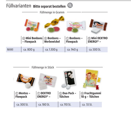 Stabile Box mit ausklappbarer Schüttöffnung, wiederbefüllbar.Ohne Inhalt!Maße: ca. 113 x 113 x 215,5 mmInhalt: siehe Füllvarinten-BildVerpackung: auf AnfrageLieferzeit: ca. 20 Arbeitstage nach Druckfreigabe, Express-Lieferung auf Anfrage!Mindestbestellmenge: 250 Stück