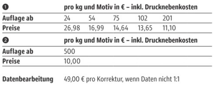 Preisliste Herz-Bonbons im Flowpack mit Logo