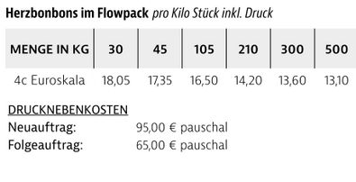 Preisliste Herzbonbons im Flowpack mit Logo Details