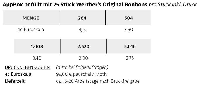 Die vielseitig befüllbare Appbox aus 100 % Papier ist ein echter Hingucker und lässt sich vollflächig veredeln. Durch ein perforiertes Türchen lässt sich die Füllung bequem entnehmen. Second Life: Nach dem Genuss eignet sich die Box perfekt zur Aufbewahrung kleiner Büroartikel – so bleibt Ihre Werbebotschaft nachhaltig im Einsatz.Gewicht: Inhalt 25 x Werther´s Original, 134gVerpackungsmaß: ca. 134 x 134 x 32 mm Verpackungseinheit: 24 Stück im KartonHaltbarkeit: 12 Monate bei sachgerechter LagerungLieferzeit: ca. 15-20 Arbeitstage nach DruckfreigabeMindestbestellmenge: 264 Stück