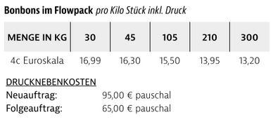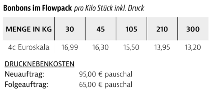 Preisliste Bonbons im Flowpack mit Logo
