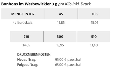Preisliste Bonbons im Werbewickler 3g mit Logo