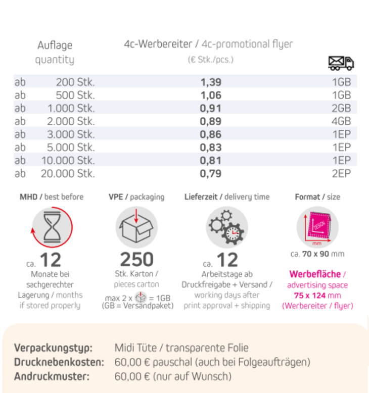 Produkt: Mini Tüte / transparente FolieInhalt: Erdbeer Chili Art.Nr. 01737; Himbeere Art.Nr. 01739; Erdbeere-Joghurt Art.Nr. 01740; frische Brise Art.Nr. 01743; Goldnüsse Art.Nr. 01744; Bayrisch Malz Art.Nr. 01745; Zitrone und Orange Art.Nr. 01747, Zitrone mit Vitamin D Art.Nr. 02750; Multivitamin Art.Nr. 02748; Kirsche mit Magnesium Art.Nr. 02749 und Hustenbonbons Art.Nr. 02751Format: ca. 70 x 90 mmWerbefläche: 4c-Werbereiter 75 x 124 mmLieferzeit: ca. 12 Arbeitstage ab Druckfreigabe + VersandVPE: 250 Stk. / KartonHaltbarkeit: ca. 12 Monate bei sachgerechter Lagerung oder ca. 10 Monate bei sachgerechter Lagerung in Bio-FolieMindestbestellmenge: 500 Stück