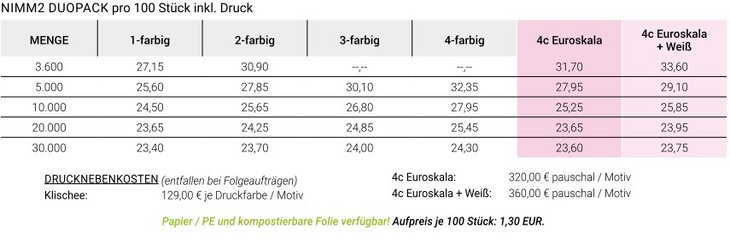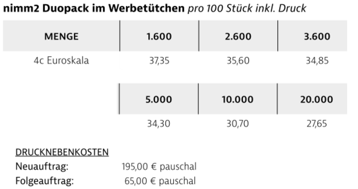 Preisliste Bonbon Nimm2 Duopack mit Logo Details