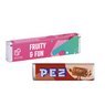 Der süße Genuss für unterwegs - Dank der kompakten Größe ist es das perfekte Give-away: Ob in der Tasche, im Rucksack oder im Auto, PEZ Bonbonriegel ist immer griffbereit und sorgt für eine süße Pause zwischendurch. Fruchtig, prickelnd und herrlich süß sorgen deine individuellen Werbebotschaften für einen einzigartigen und langanhaltenden Geschmack. Die kleinen, rechteckigen Bonbons gibt es in den Sorten Zitrone, Orange, Erdbeere, Kirsche, Fizzy und Cola. Begeistere deine Kunden und wecke Kindheitserinnerungen!Bedruckung: 4c-EuroskalaInhalt: 12 Bonbonstückchen PEZ im Riegel in den Sorten Zitrone, Orange, Erdbeere, Kirsche, Fizzy (Erdbeer, Tutti Frutti und Apfel) oder Cola (nur sortenrein), 8,5gHaltbarkeit: 12 Monate; kompostierbare Folie: 6 Monate Format: Ca. 60 x 16 x 9 mmMaterial: Banderole: Papier, weißVerpackung: Kartons à 1.000 StückLieferzeit: In aller Regel 8 Wochen nach Druckfreigabe. Mindestbestellmenge: 10.000 Stück