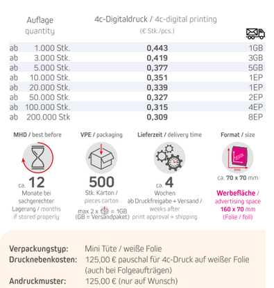 Inhalt: Brause-HerzenGeschack: Erdbeere und HimbeereProdukt: Mini Tüte / weiße FolieFormat: ca. 70 x 70 mmDruck: 4c-DigitaldruckWerbefläche: 160 x 70 mmLieferzeit: ca. 4 Wochen ab Druckfreigabe + VersandVPE: 500 Stk. / KartonHaltbarkeit: ca. 12 Monate bei sachgerechter LagerungMindestbestellmenge: 1.000 Stück