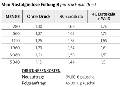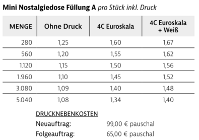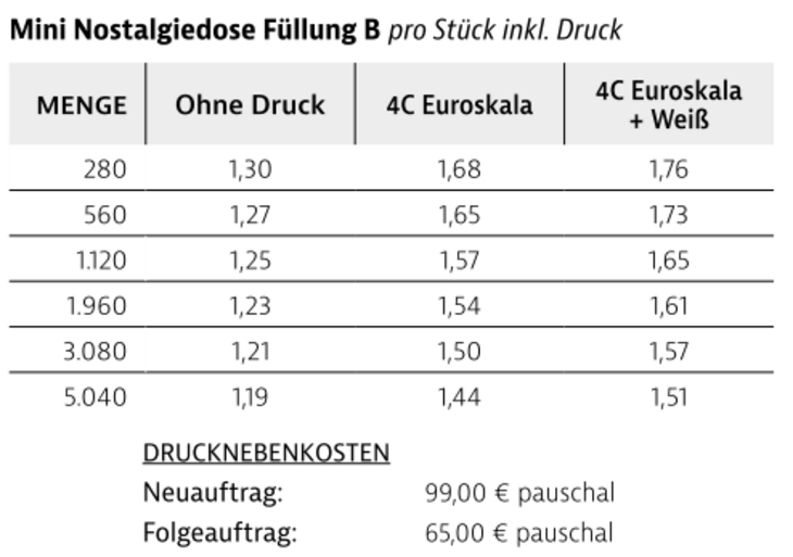 Preisliste Füllung A Nostalgiedose (Mini) verschiedene Füllungen mit Logo Details