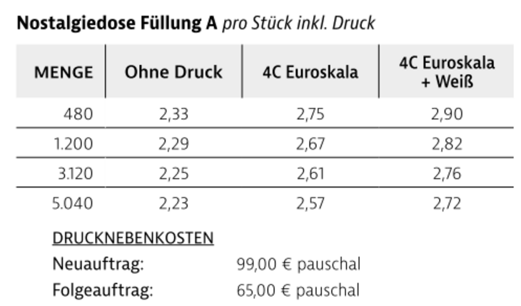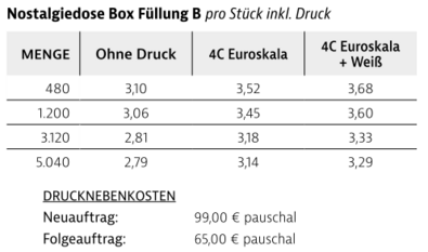 Preisliste Nostalgiedose mit Logo Bonbons Details
