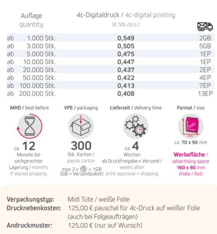 Produkt: Midi Tüte / weiße FolieInhalt: Bunte Erdnüsse 15gFormat: ca. 70 x 90 mmDruck: 4c-DigitaldruckWerbefläche: 160 x 90 mmLieferzeit: ca.l 4 Wochen ab Druckfreigabe + VersandVPE: 300 Stk. / KartonHaltbarkeit: ca. 12 Monate bei sachgerechter LagerungMindestbestellmenge: 1000 Stück