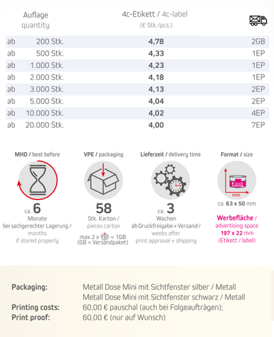 Verpackungstyp: Metalldose Mini mit Sichtfenster / Metall schwarzInhalt: 70g Bunte Schoko Erdnüsse Format: ca. 63 x 50 mmDruck: Digitaldruck Werbefläche: 4c-Etikett 197 x 22 mm Lieferzeit: ca. 3 Arbeitswochen ab Druckfreigabe + VersandVPE: 58 Stk. / KartonHaltbarkeit: ca. 6 Monate bei sachgerechter LagerungMindestbestellmenge: 200 Stck.