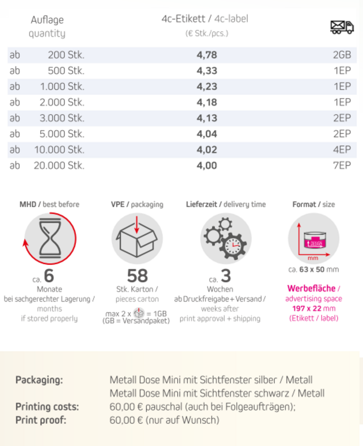 Verpackungstyp: Metalldose Mini mit Sichtfenster / Metall silber Inhalt: 70g Bunte Schoko Erdnüsse Format: ca. 63 x 50 mmDruck: Digitaldruck Werbefläche: 4c-Etikett 197 x 22 mm Lieferzeit: ca. 3 Arbeitswochen ab Druckfreigabe + VersandVPE: 58 Stk. / KartonHaltbarkeit: ca. 6 Monate bei sachgerechter LagerungMindestbestellmenge: 200 Stck.