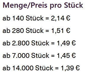 Ideal als Beileger für Ihre Produktsendungen oder für kreative Mailings. Ein feines, mit Lebensmittelfarben nach Ihren Wünschen bedrucktes M-logolini-Plätzchen bzw. -Praliné in einer weißen Sichtfensterkartonage. Die feinen Plätzchen aus Buttermürbeteig können Sie in unseren Geschmacksrichtungen Mandel sowie Schoko fertigen lassen.Druckfläche: ca. 32 x 32 mmPlätzchenmaß: ca. 38 x 38 mmProduktionseinheit (PE): 140 StückVerpackungsmaß: 92 x 92 x 16 mmGewicht: ca. 30 gHaltbarkeit: mind. 12 WochenGeschmacksrichtungen: Mandel, SchokoMindestbestellmenge: 140 Stück