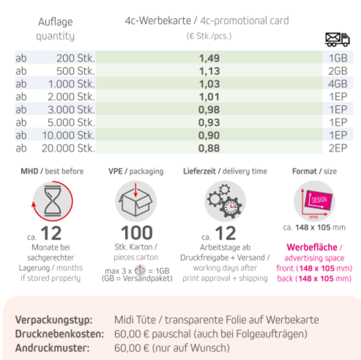 Zutaten Bio Gewürzmischung Alleskönner: Steinsalz, Tomaten*, Zitronenschale*, Pfeffer*, Zwiebeln*, Paprika*, Knoblauch*, Thymian*, Rosmarin*, Basilikum*, Lavendel*; *aus kontrolliert biologischem Anbau.Zutaten Bio Gewürzmischung Feuer und Flamme: Steinsalz, Chili*, Pfeffer*, Paprika*, Knoblauch*; *aus kontrolliert biologischem Anbau.( Art.Nr. 01195 )Verpackungstyp: Midi Tüte / transparente Folie mit WerbekarteFormat: ca. 148 x 105 mmDruckart: DigitaldruckWerbefläche: 4c-Werbekarte 148 x 105 mmHaltbarkeit: ca. 12 Monate bei sachgerechter Lagerung oder ca. 10 Monate bei sachgerechter Lagerung in Bio-FolieVerpackung: 100 Stück / KartonLieferzeit: ca. 12 Arbeitstage ab Druckfreigabe + VersandMindestmenge: 200 Stk.