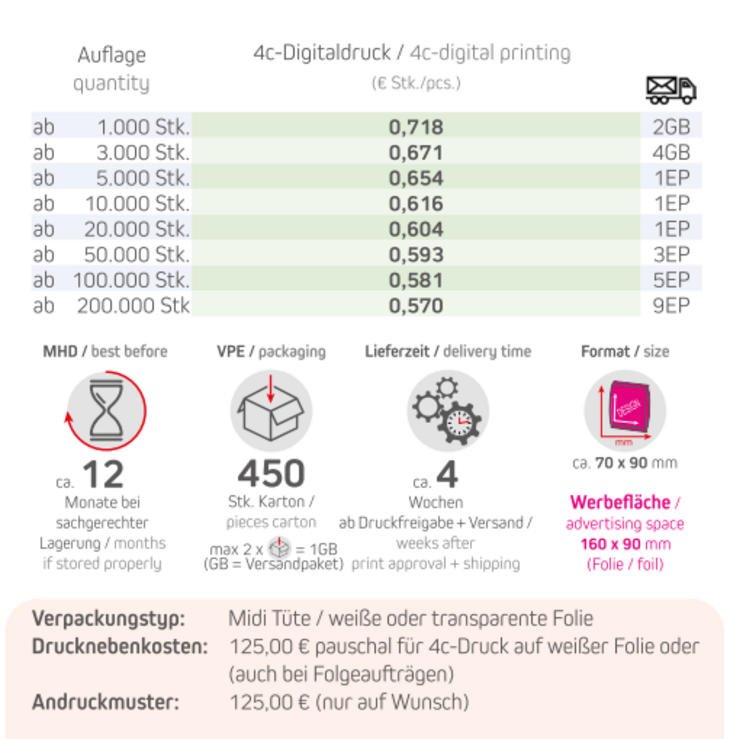 Inhalt: Zutaten Bio Gewürzmischung Alleskönner: Steinsalz, Tomaten*, Zitronenschale*, Pfeffer*, Zwiebeln*, Paprika*, Knoblauch*, Thymian*, Rosmarin*, Basilikum*, Lavendel*; *aus kontrolliert biologischem Anbau. (Artikel: MF-02611)Inhalt: Zutaten Bio Gewürzmischung Feuer und Flamme: Steinsalz, Chili*, Pfeffer*, Paprika*, Knoblauch*; *aus kontrolliert biologischem Anbau. (Artikel: MF-02612)Verpackungstyp: Midi-Tüte/ weiße FolieFormat: 70 x 90 mmDruck: 4c-DigitaldruckWerbefläche: 160 x 90 mm Lieferzeit: ca. 4 Wochen ab Druckfreigabe + VersandMindestmenge: 1.000 Stk.Haltbarkeit: ca. 12 Monate bei sachgerechter Lagerung oder ca. 10 Monate bei sachgerechter Lagerung in Bio-FolieVerpackung: 300 Stück / Karton