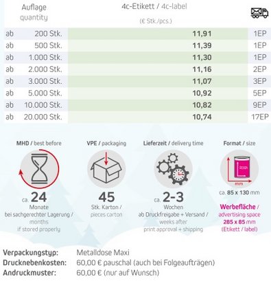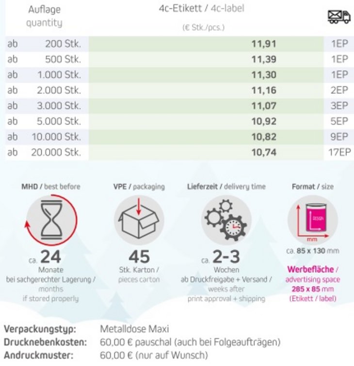 Preisliste Bio Glühweingewürz fein ca. 140g Metalldose Maxi silber mit Logo Details