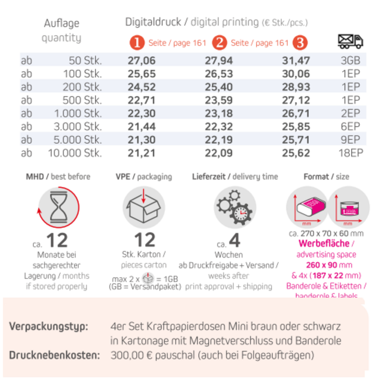 Preisliste Geschenk-Set Premium rot + 4 x Gewürz in Kraftpapierdoesen Mini mit Logo Details