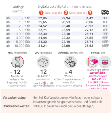 Preisliste Geschenk-Set Premium schwarz + 4 x Gewürz in Kraftpapierdoesen Mini mit Logo Details