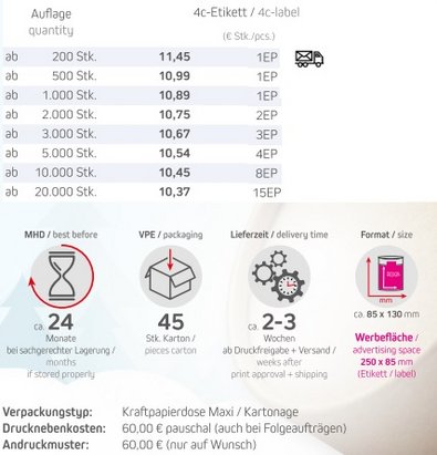 Preisliste Glühweingewürz grob ca. 150g Biologisch abbaubare Eco Pappdose Maxi mit Logo Details