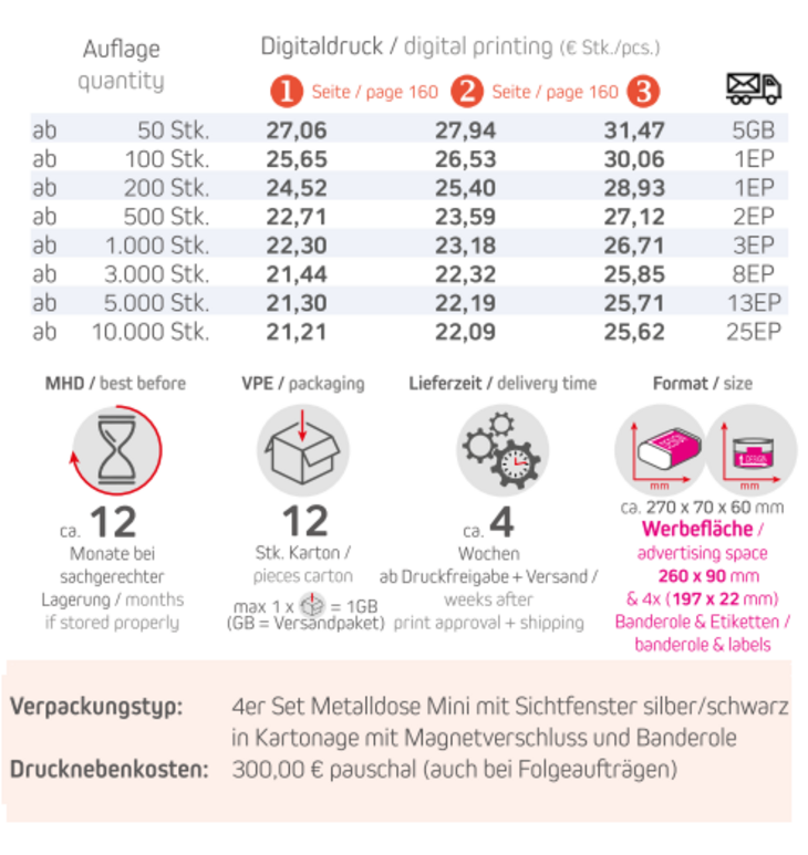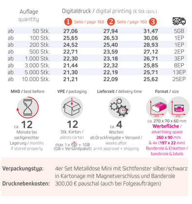 Verpackungstyp: 4er Set Metalldose Mini mit Sichtfenster silber/schwarz in Kartonage rot mit Magnetverschluss und Banderole